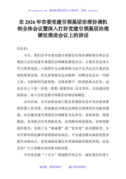 / 在2026年市委党建引领基层治理协调机制全体会议暨深入打好党建引领基层治理硬仗推进会议上的讲话