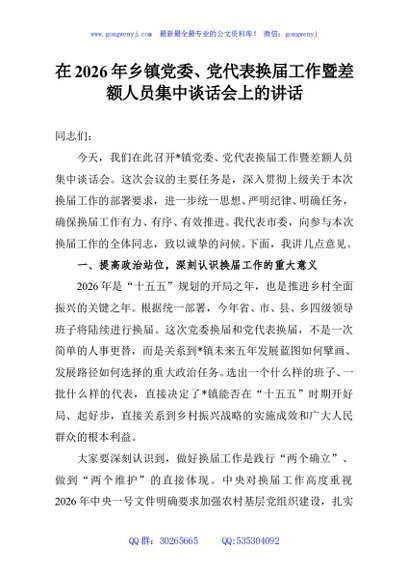 / 在2026年乡镇党委、党代表换届工作暨差额人员集中谈话会上的讲话