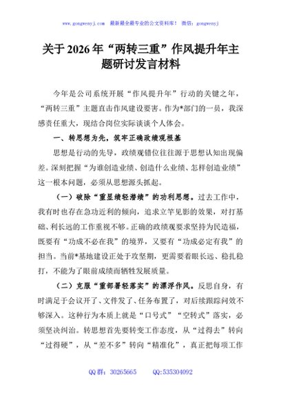 / 关于2026年“两转三重”作风提升年主题研讨发言材料