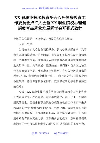 / XX省职业技术教育学会心理健康教育工作委员会成立大会暨XX职业院校心理健康教育高质量发展研讨会开幕式致辞