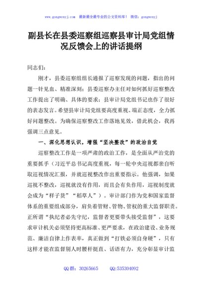 / 副县长在县委巡察组巡察县审计局党组情况反馈会上的讲话提纲