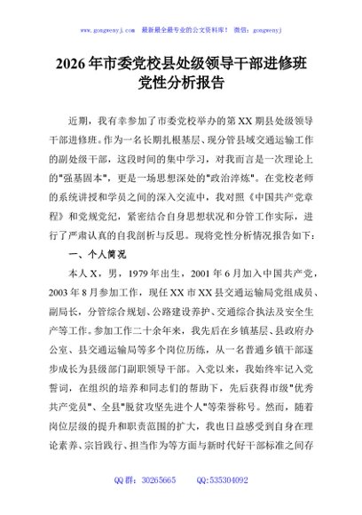 / 2026年市委党校县处级领导干部进修班党性分析报告