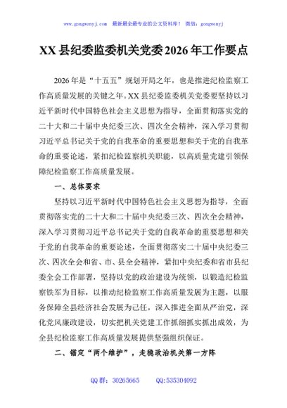 / XX县纪委监委机关党委2026年工作要点