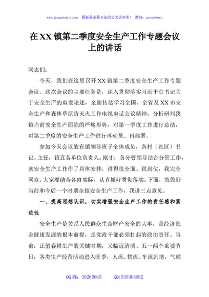/ 在XX镇第二季度安全生产工作专题会议上的讲话