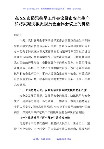 / 在XX市防汛抗旱工作会议暨市安全生产和防灾减灾救灾委员会全体会议上的讲话