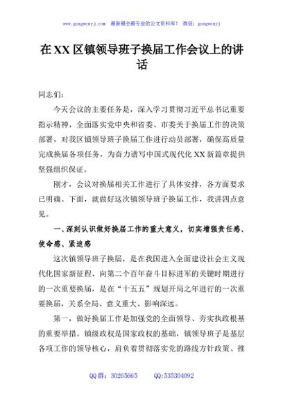 / 在XX区镇领导班子换届工作会议上的讲话