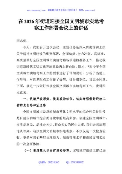 / 在2026年街道迎接全国文明城市实地考察工作部署会议上的讲话