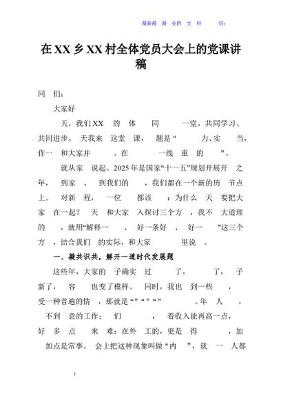 / 在XX乡XX村全体党员大会上的党课讲稿