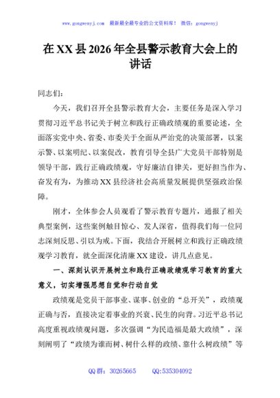 / 在XX县2026年全县警示教育大会上的讲话