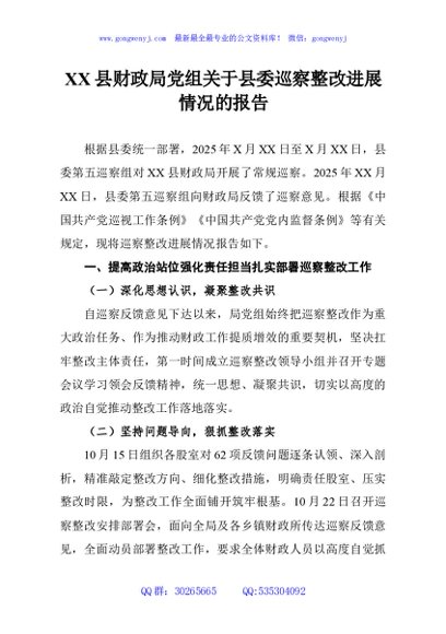 / XX县财政局党组关于县委巡察整改进展情况的报告