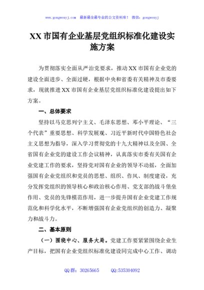 / XX市国有企业基层党组织标准化建设实施方案