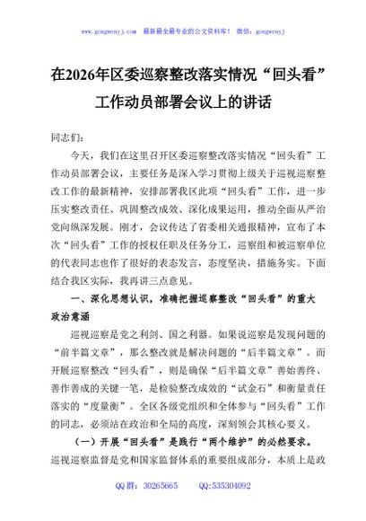 / 在2026年区委巡察整改落实情况“回头看”工作动员部署会议上的讲话