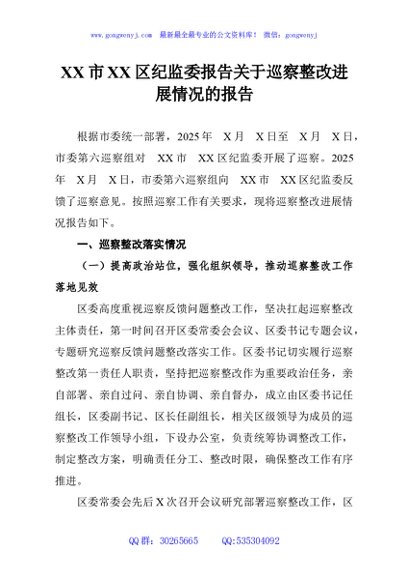/ XX市XX区纪监委报告关于巡察整改进展情况的报告