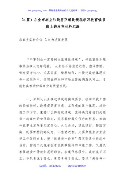 / (8篇)在全市树立和践行正确政绩观学习教育读书班上的发言材料汇编