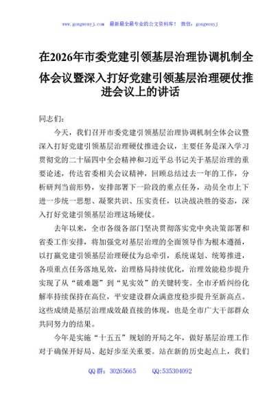 / 在2026年市委党建引领基层治理协调机制全体会议暨深入打好党建引领基层治理硬仗推进会议上的讲话
