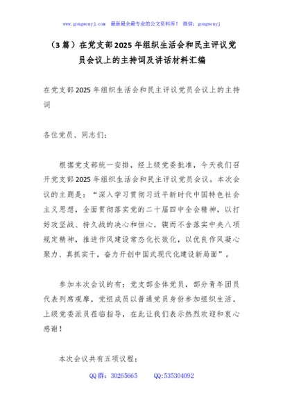 (3篇)在党支部2025年组织生活会和民主评议党员会议上的主持词及讲话材料汇编