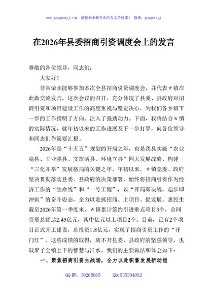 / 在2026年县委招商引资调度会上的发言