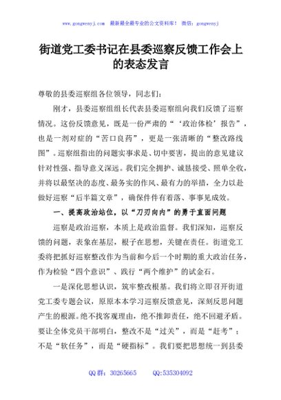 / 街道党工委书记在县委巡察反馈工作会上的表态发言