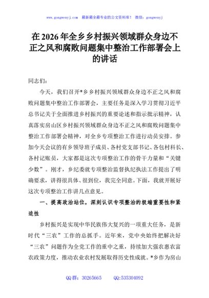 / 在2026年全乡乡村振兴领域群众身边不正之风和腐败问题集中整治工作部署会上的讲话
