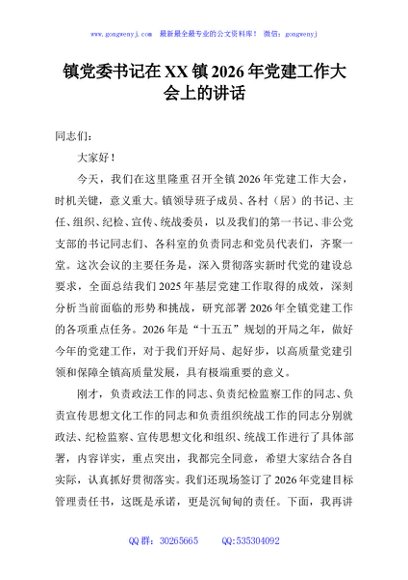 / 镇党委书记在XX镇2026年党建工作大会上的讲话
