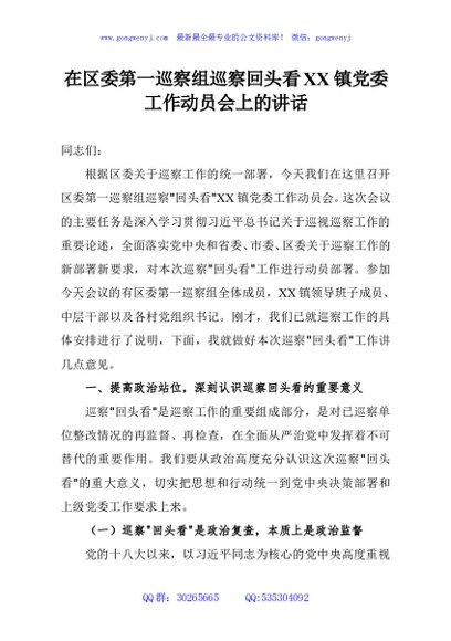 / 在区委第一巡察组巡察回头看XX镇党委工作动员会上的讲话