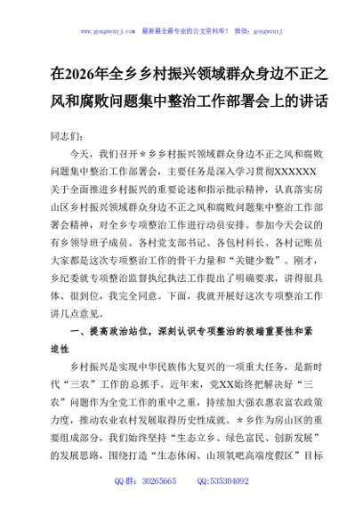 / 在2026年全乡乡村振兴领域群众身边不正之风和腐败问题集中整治工作部署会上的讲话