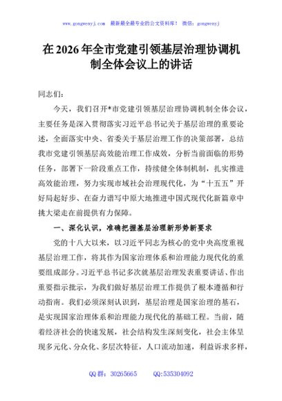 / 在2026年全市党建引领基层治理协调机制全体会议上的讲话