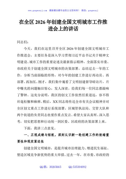 / 在全区2026年创建全国文明城市工作推进会上的讲话