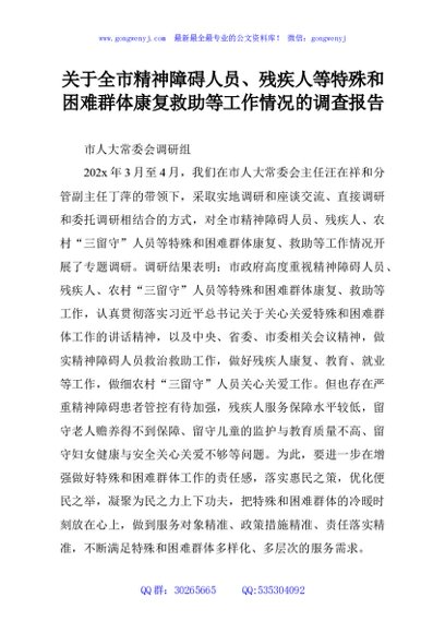 / 关于全市精神障碍人员、残疾人等特殊和困难群体康复救助等工作情况的调查报告