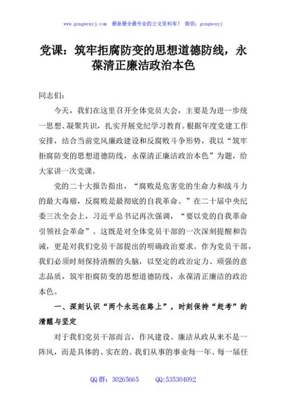 / 党课:筑牢拒腐防变的思想道德防线,永葆清正廉洁政治本色