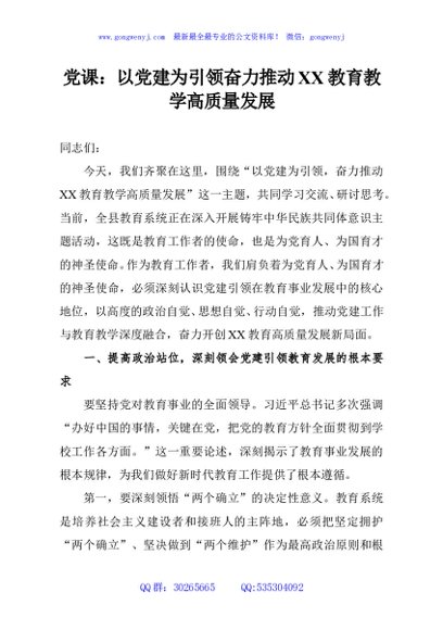 / 党课:以党建为引领奋力推动XX教育教学高质量发展