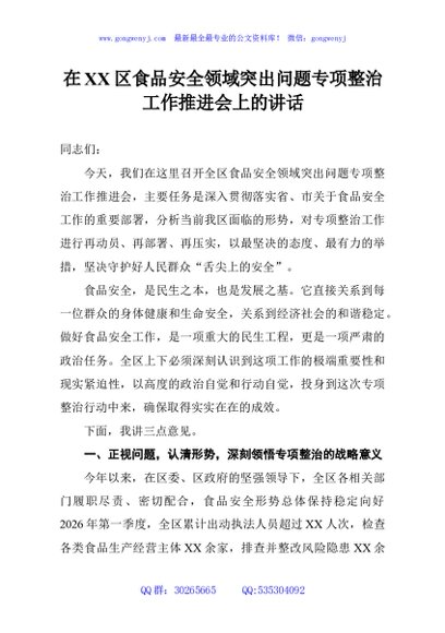 / 在XX区食品安全领域突出问题专项整治工作推进会上的讲话