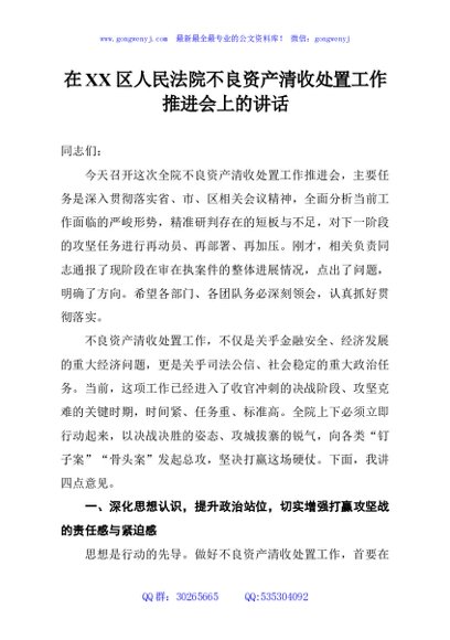 / 在XX区人民法院不良资产清收处置工作推进会上的讲话