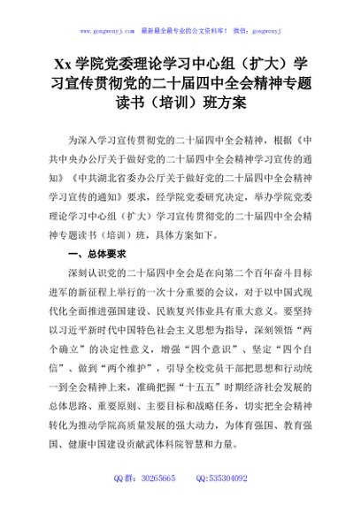 Xx学院党委理论学习中心组(扩大)学习宣传贯彻党的二十届四中全会精神专题读书(培训)班方案