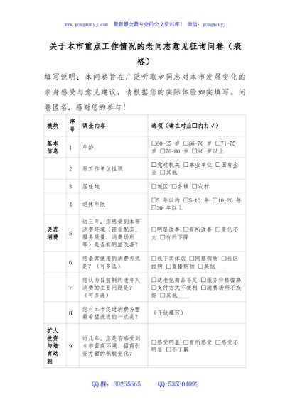 / 关于本市重点工作情况的老同志意见征询问卷(表格)