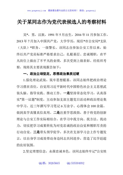 / 关于某同志作为党代表候选人的考察材料