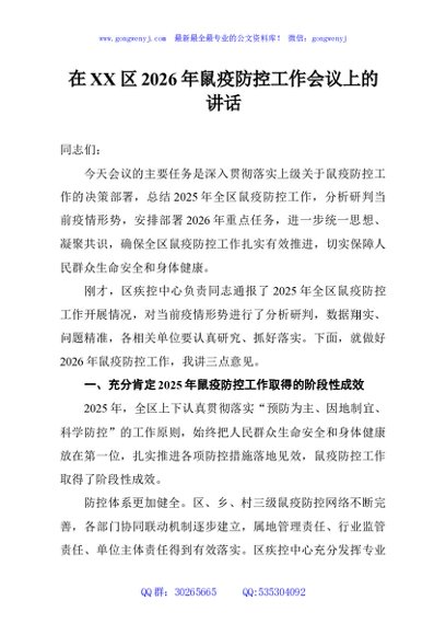 / 在XX区2026年鼠疫防控工作会议上的讲话