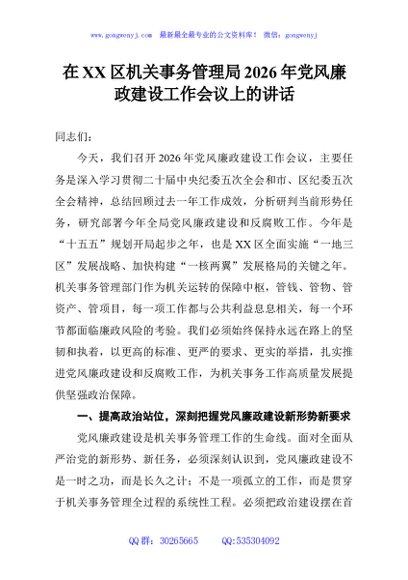 / 在XX区机关事务管理局2026年党风廉政建设工作会议上的讲话