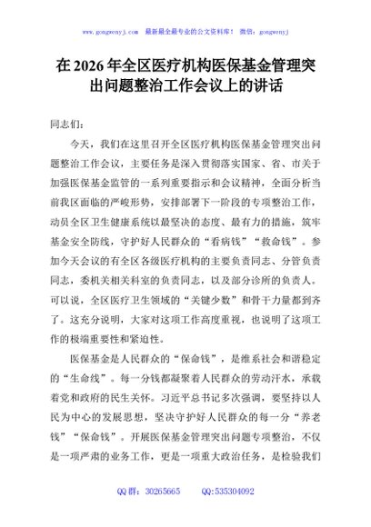 / 在2026年全区医疗机构医保基金管理突出问题整治工作会议上的讲话