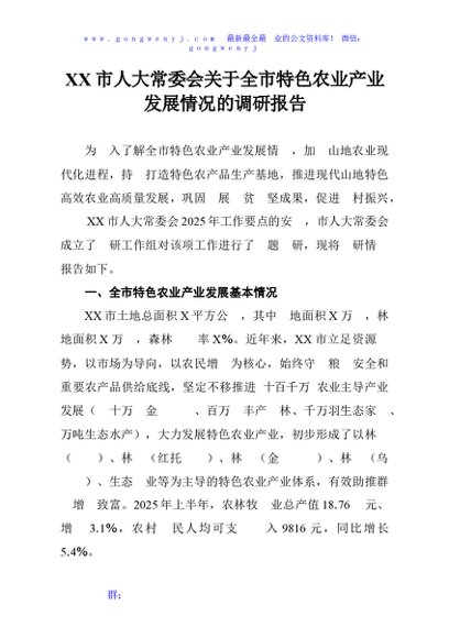 / XX市人大常委会关于全市特色农业产业发展情况的调研报告