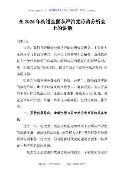 / 在2026年街道全面从严治党形势分析会上的讲话