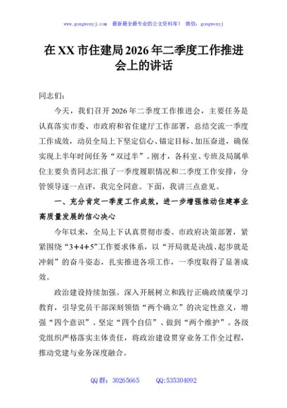/ 在XX市住建局2026年二季度工作推进会上的讲话