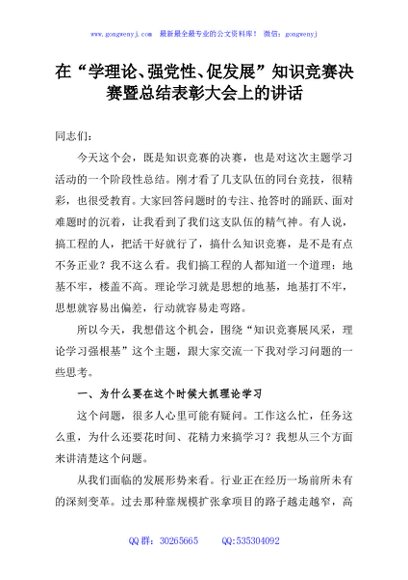 / 在“学理论、强党性、促发展”知识竞赛决赛暨总结表彰大会上的讲话