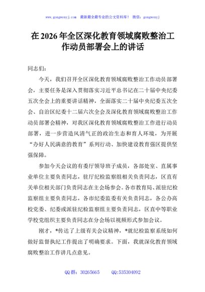 / 在2026年全区深化教育领域腐败整治工作动员部署会上的讲话