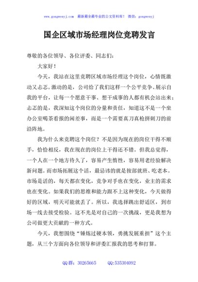 / 国企区域市场经理岗位竞聘发言