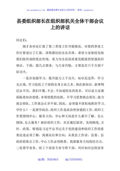 / 县委组织部长在组织部机关全体干部会议上的讲话