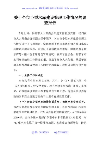 / 关于全市小型水库建设管理工作情况的调查报告