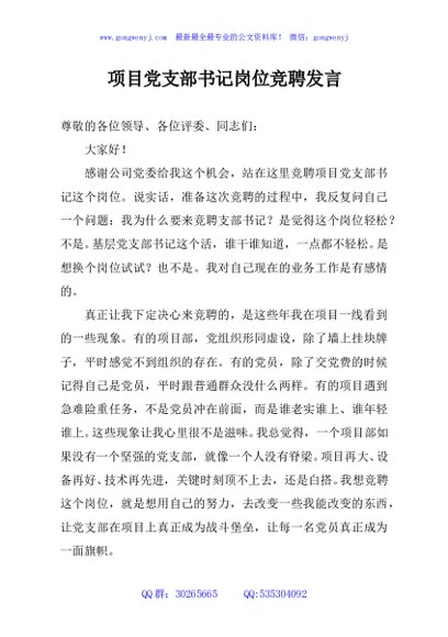 / 项目党支部书记岗位竞聘发言