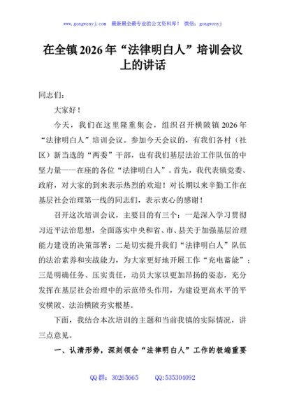 / 在全镇2026年“法律明白人”培训会议上的讲话