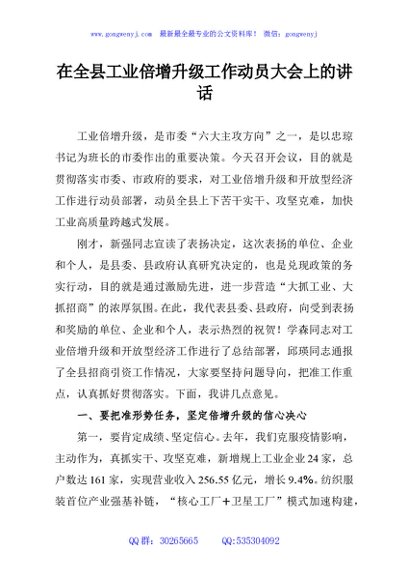 / 在全县工业倍增升级工作动员大会上的讲话
